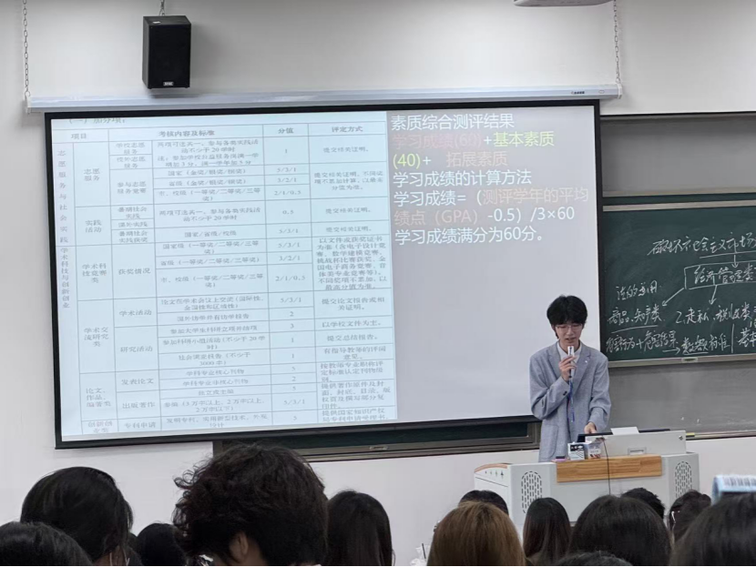赵宇博详细解读了素质综合测评的评定规则。同时,他重点强调“综测评定以学校文件为准,各项加分需提交对应证明材料,避免因材料缺失影响分值”,为同学们梳理出清晰的努力方向。
